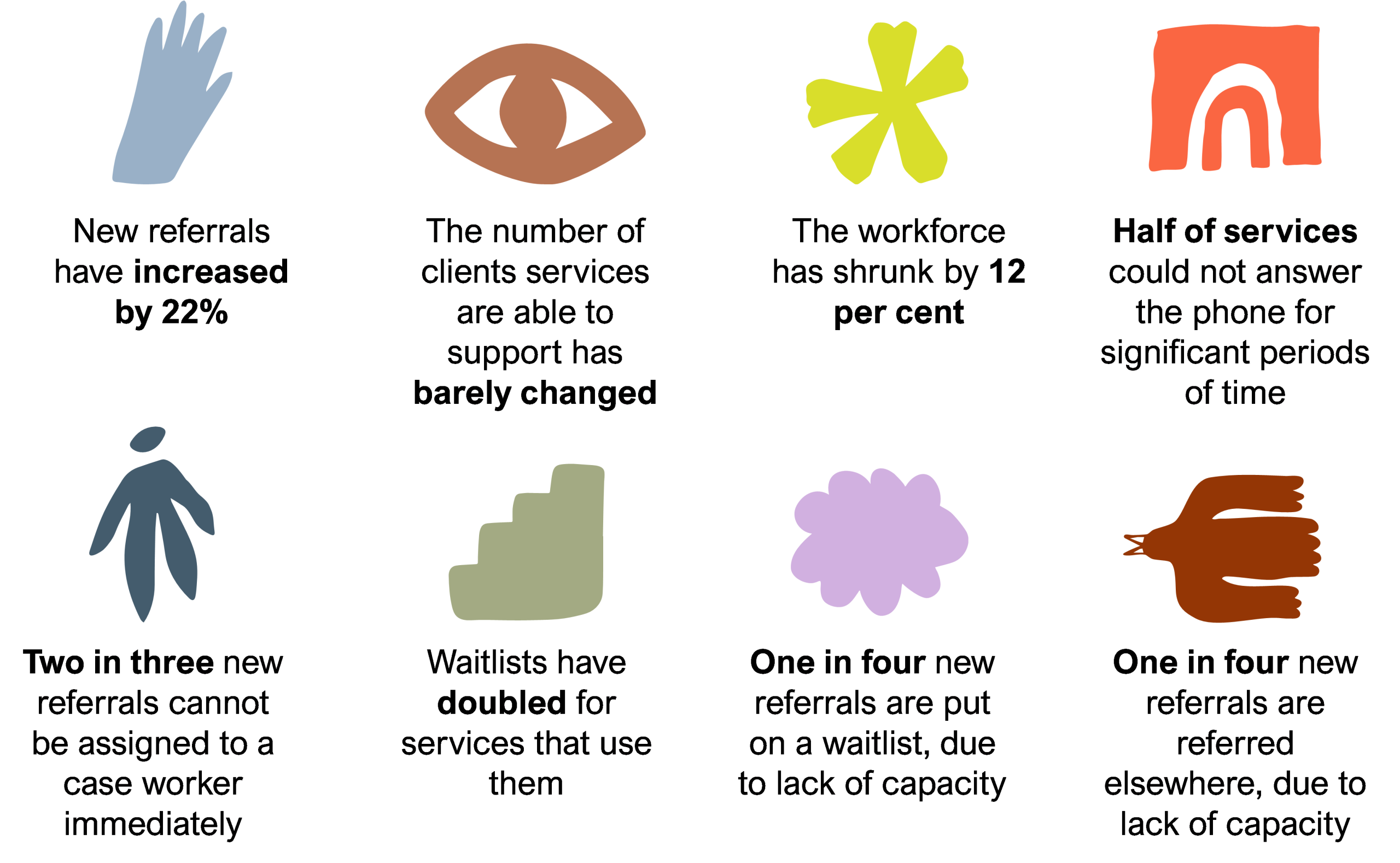 Specialist DFV services are seeing the consequences of this increased demand first hand. These services provide a range of case management and case coordination supports to help victim-survivors stay safe, escape violence and get their lives back on track. This includes safety planning, assisting with security enhancements, referrals to other services and ongoing monitoring of the victim-survivor’s situation. Some specialist DFV services also directly provide therapeutic counselling, legal assistance and homelessness services for victim-survivors.